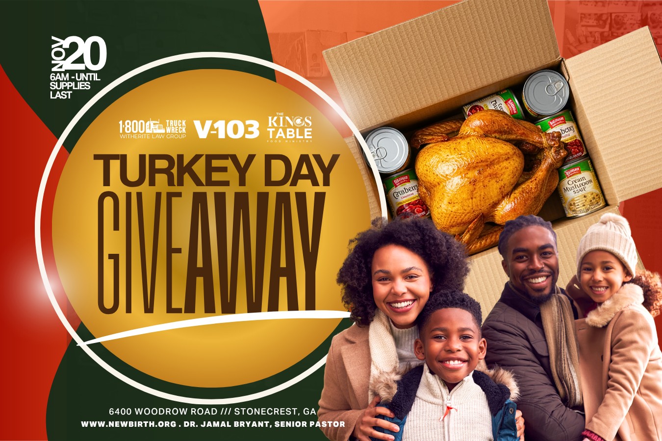 The King’s Table, our food distribution ministry, is partnering with 1-800-Truck-Wreck, V-103, Bojangles, and the DeKalb County Government to bless families across our community memorably. This year, we’re giving away over 4,000+ turkeys and meals to ensure every household has what they need to gather, give thanks, and enjoy a full holiday.